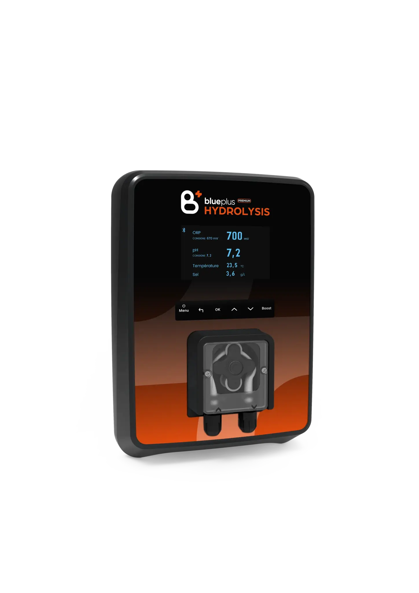 • Intelligente pH-regeling in verhouding tot het volume van het zwembadvolume in zuur (pH-) of base (pH+) modus