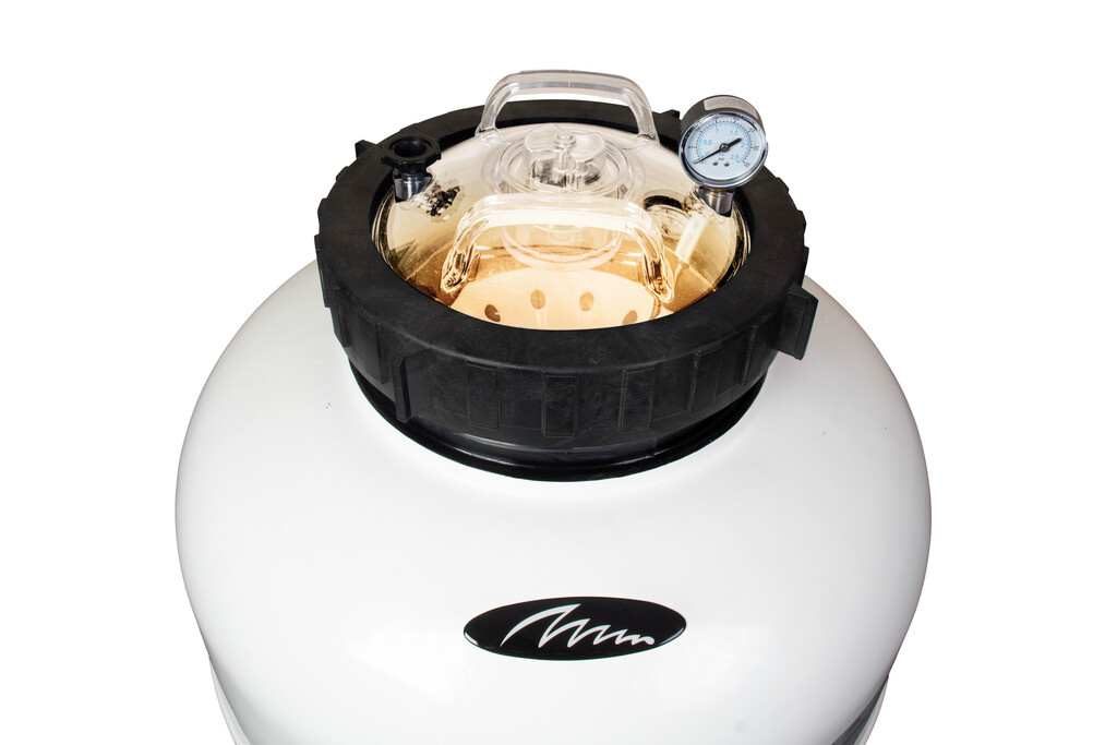-Groot transparant deksel met ontluchtingsventiel en manometer dat op zijn plaats wordt gehouden door een eenvoudig vast te schroeven kraag, versterkt met glasvezel voor een maximale sterkte en duurzaamheid.
